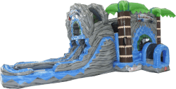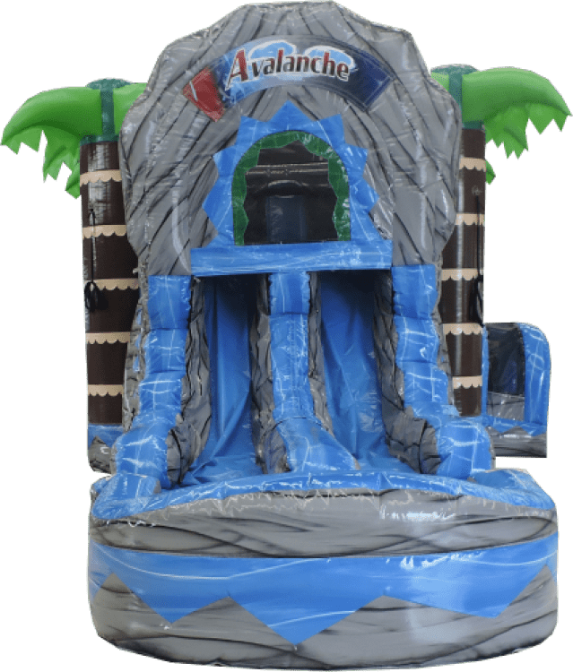 Race into fun with the 13' Avalanche Combo Double Lane! This exciting inflatable features a spacious bounce house, an interior climbing wall, and two side-by-side slides perfect for friendly racing. Designed with a cool gray and blue color scheme and palm tree accents, it brings tropical vibes and tons of energy to any party.