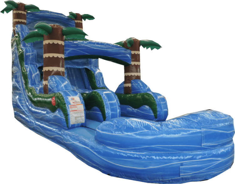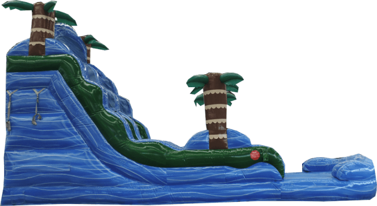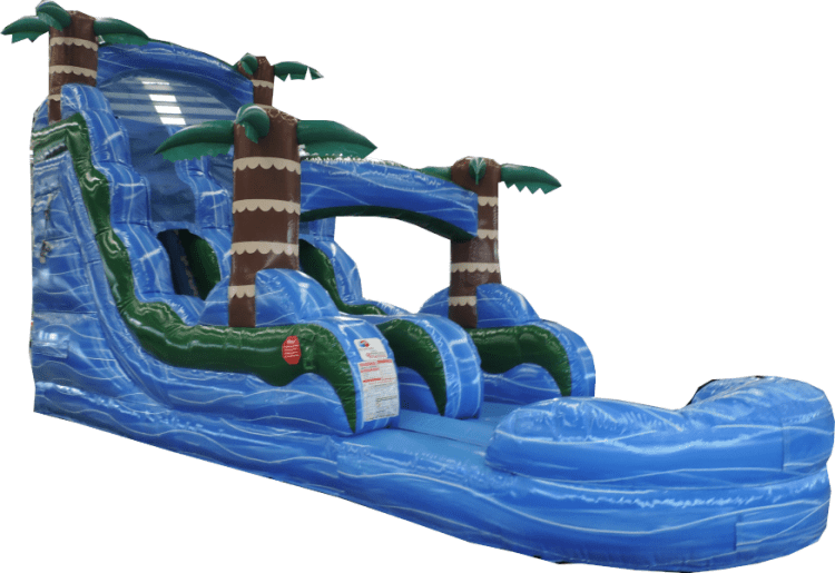 Make a splash with the Blue Hurricane! This 18-foot tall single-lane water slide features vibrant blue and green colors with tropical palm tree accents, bringing the ultimate island vibes to your backyard. Designed for kids ages 4 to 14, this slide offers safe, fast-paced fun with netting at the top, inflatable safety walls, and a built-in splash area at the bottom.